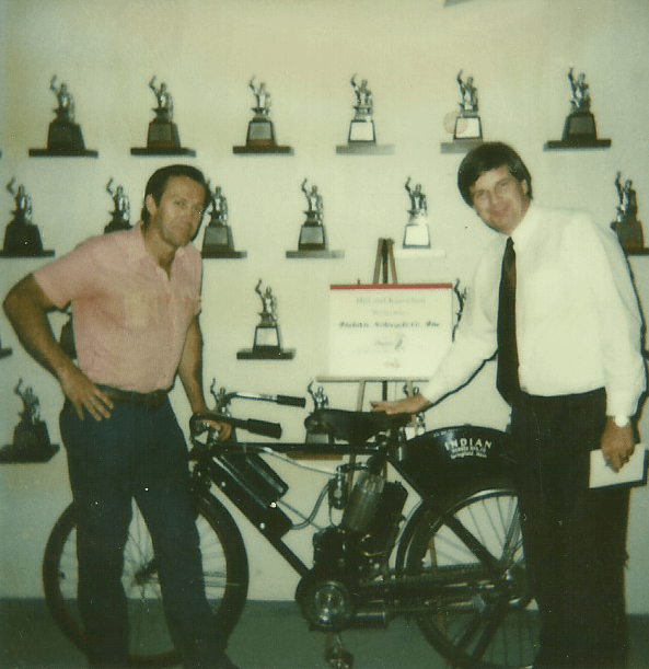 Moving house ain’t the easiest time when it comes to finding things like shoes, important documents or old photos. However, a week after mentioning this Indian in my blog, I found the photo I’d been looking for. That’s the 1906 Indian we rented from the owner (left), standing in front of all the Silver Anvil awards at the New York headquarters of the PR agency Hill and Knowlton. Yours truly is on the right. If you read the blog, you’ll know already that all the creativity and effort were wasted.