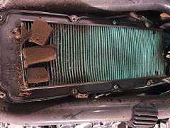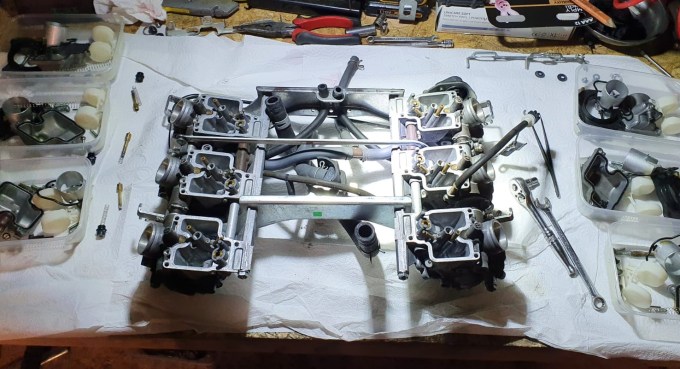 Andy turned out to be a qualified motorcycle mechanic who had never worked on a Valkyrie but was happy to strip, clean and rebuild the six carbs for me. You can see his neat, well-ordered approach in the lead photo. As soon as he had the tank off, he found an incredibly dirty air filter that could have been the main problem all on its own. That in itself was a surprise, because in the seven years I’ve owned the bike I’ve always had it serviced by Honda main dealers to maintain its unbroken full service history since it was new in 2002. I’d have expected the dealers concerned to have replaced the air filter whenever required; I’ll have to check through old paperwork to see whether they did.