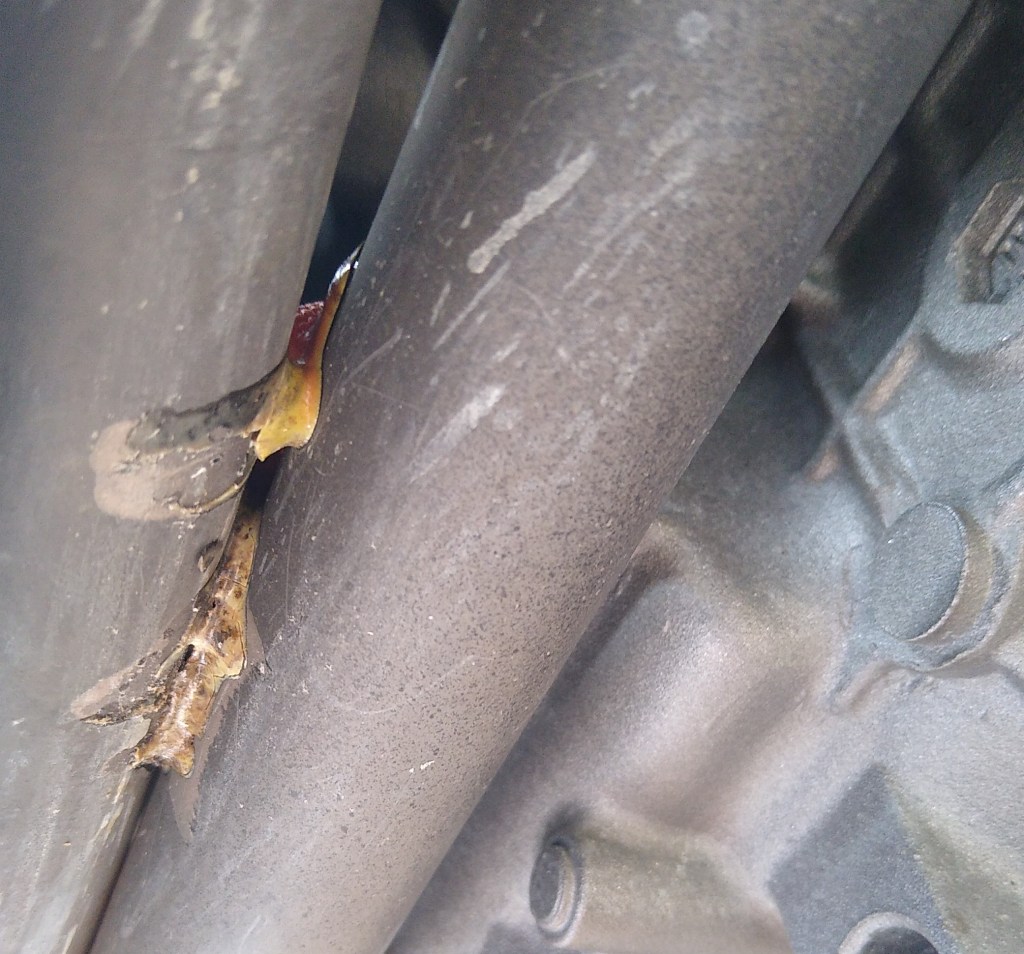 There’s a bizarre-looking piece of bright orange webbed strap hanging between the header pipes on the right-hand side. The only possible explanation for its presence is that it had been used to tie down the bike at some point in its travels, although there’s no logic to its placement. Tying down the bike through that area makes no sense at all. Someone clearly couldn’t get the strap off again and so has cut it with a knife just below the pipes. Closer investigation shows that the material has in fact melted into the headers, and it takes some careful poking and scraping to detach it completely. Fortunately the point of melting is behind the headers, and they’re hidden in turn behind bolt-on chrome covers.