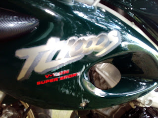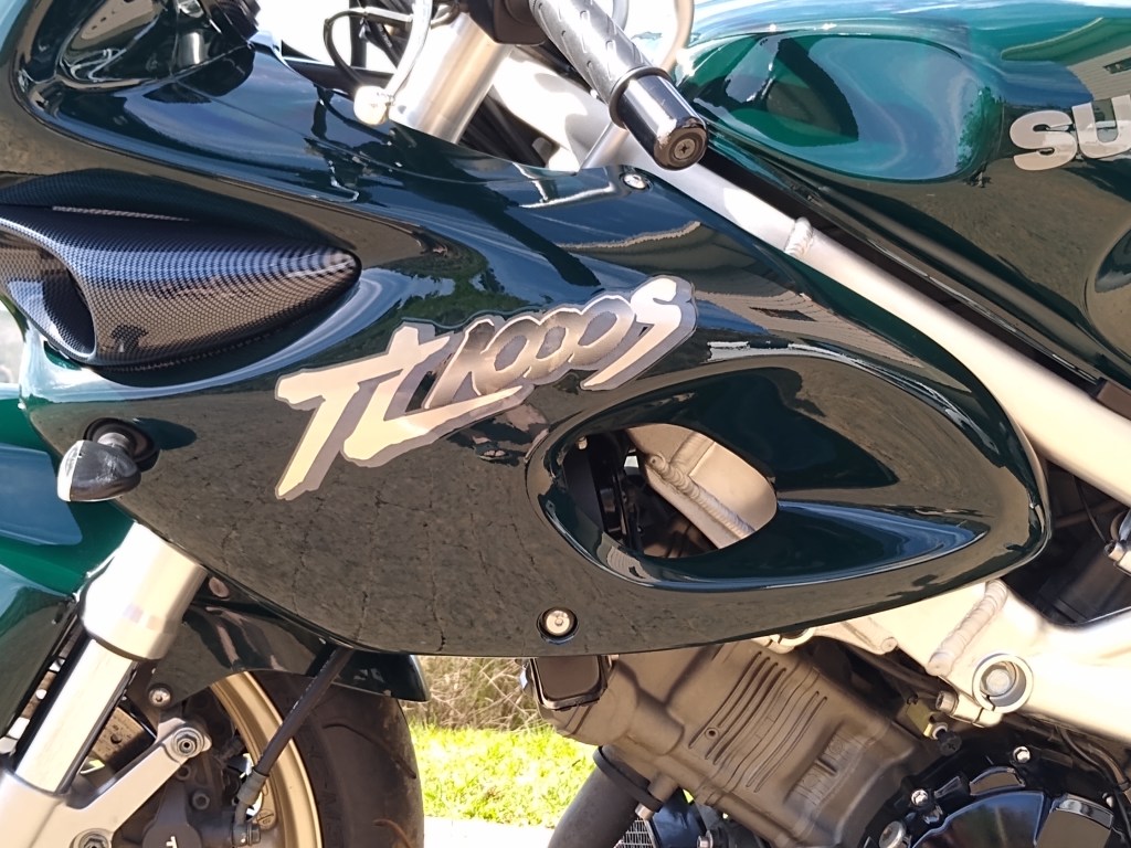 The work was superb. Without so much as a VIN number from me, Slig had matched the 1997 green exactly and covered the gold TL1000S decal in a clear coat of polyurethane so that it looked like new. It has taken me many months to find that original decal, with a friend in Japan trying to locate one there to no effect. I eventually found online what may well have been the last one in the world.