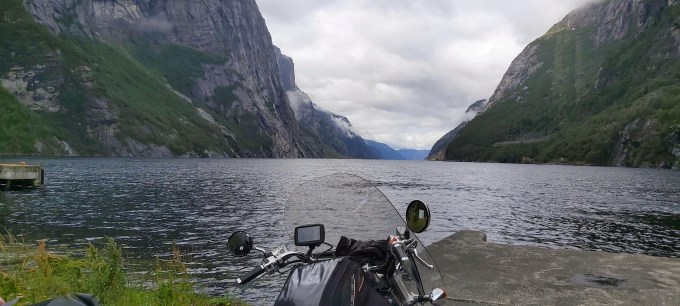 The smooth road out of Kvinesdal meandered along the edge of the fjord, offering wonderful vistas at every turn. That first morning of the holiday proper was made even more memorable by the lack of traffic – we came across no more than eight cars in the first couple of hours. The weather was warm and dry as we climbed up what became a seemingly endless series of hairpin bends. They were, if anything, more challenging than anything we’ve encountered in the Jura, Alps, Dolomites or Rockies. I thanked my lucky stars for the brand-new Bridgestone Exedra tyres that made rapid bend-swinging such a delight, and the new brake pads front and rear that helped slow us down. This was exhilarating stuff, with many of the corners needing first gear and huge handlebar input to keep the whole ensemble on track.