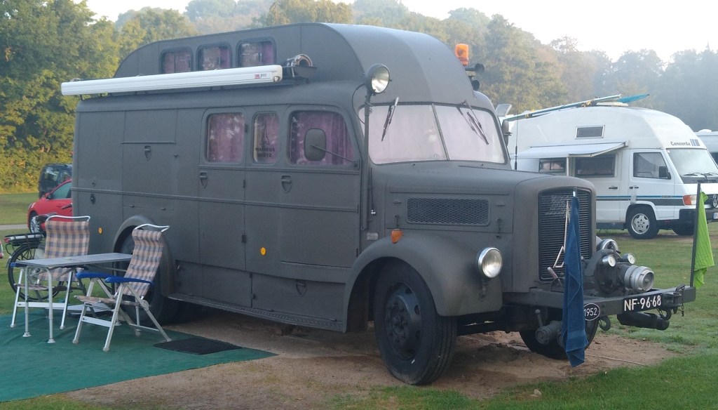 We found a decent campsite at Rødby in south-eastern Denmark, just 15 minutes from the ferry that would take us next morning to Puttgarden in Germany. I’d bought a flexible ticket with Scandlines (an €11 premium on a €49 fare), so it was easy to change the date. The campsite was right on a lake and within walking distance of the town. Among the usual array of camper vans and caravans was the green vehicle you see here, clearly an army ambulance or fire truck dating from 1952 and converted into a camper van.