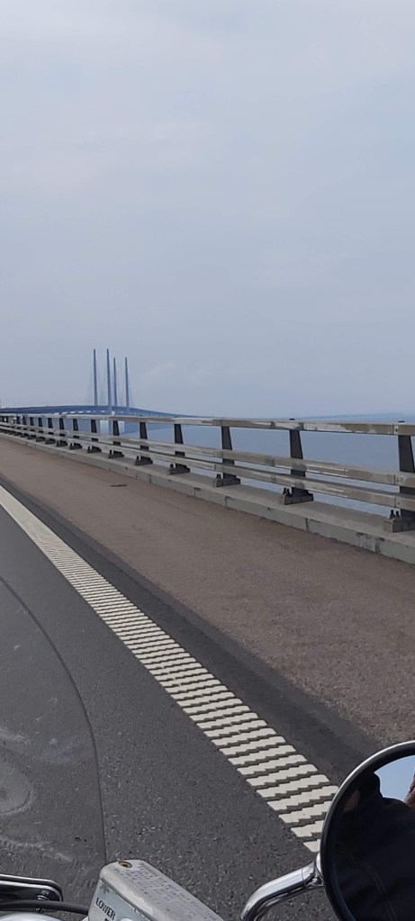 Having cut out the northern leg of our itinerary, we were now several days ahead of schedule. That was a first; on almost all previous trips, before we retired, there was a finite amount of time to reach our destination, get home again and head back to work. That led to sometimes more rigorous daily mileage targets than seemed ideal. Now, we considered various options, including riding north around the Baltic Sea to Finland, since we were in the area, but it looked a hell of a long way and maybe a bit too close to the dreaded Russia. We’d have to ride through Russia on the way back, or take a ferry to Estonia – way too much extra travelling. A gentle meander southward through Sweden, into Denmark and on to Germany seemed more appealing. Lunch next day with some Swedish friends in Uppsala brought the suggestion that we might enjoy the island of Öland on the east coast, so we spent a couple of nights there. You reach the island via a 6km bridge, which gave us a foretaste of the next stage of our journey.